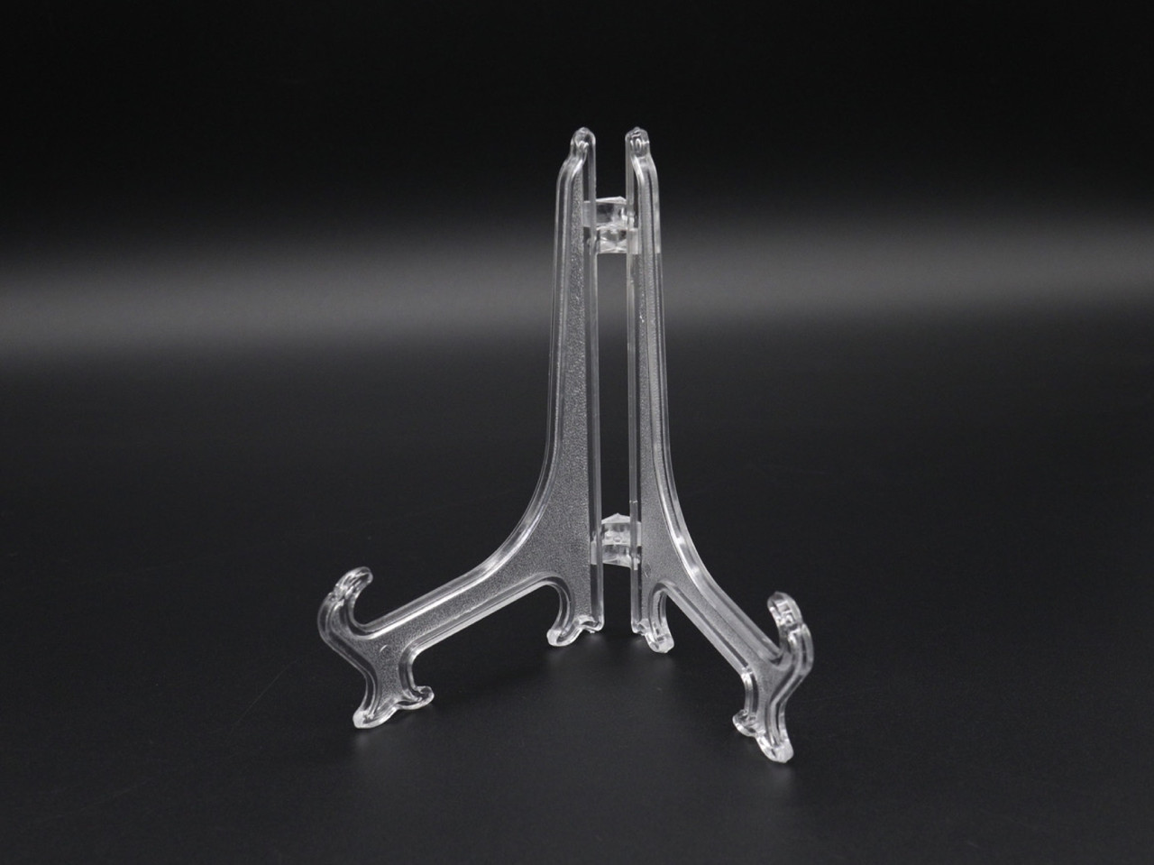 Підставка під декоративну тарілку надійно фіксує виріб під кутом 75-80 градусів. Підставки складаються з 2 частин, завдяки чому розміщення ніжок можна регулювати. Вони виготовлені з прозорого пластику і вписуються в будь-який інтер'єр або виставкову композицію. Тримач тарілок можна використовувати для розміщення фотографій, невеликих картин, іншої сувенірної продукції.