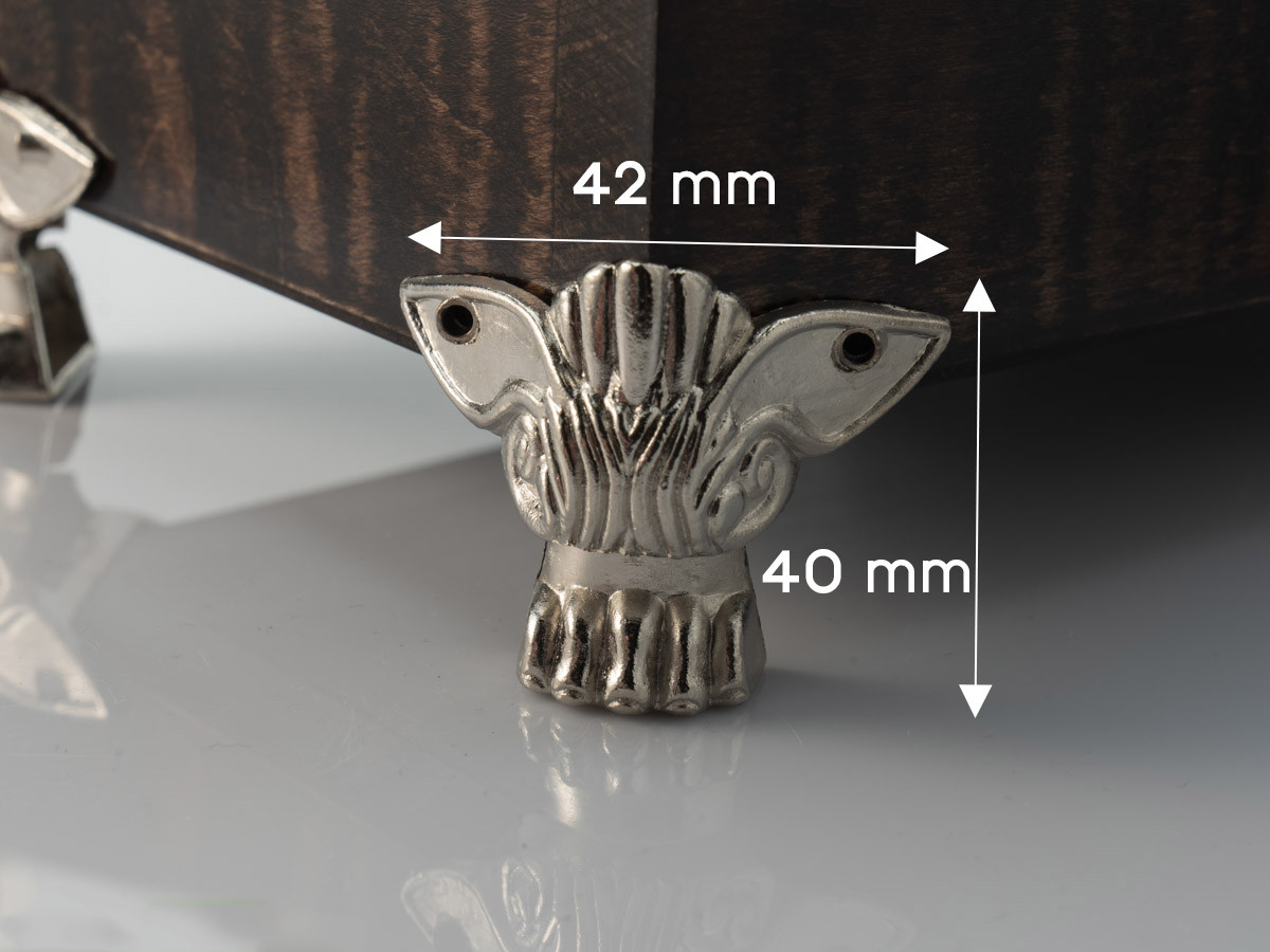 Перетворити зовнішній вигляд шкатулок та скринь можна за допомогою спеціальних ніжок. Вироби виготовлені з якісного металу різноманітних форм і розмірів. Вони кріпляться спеціальними шурупами. Таке кріплення зробить конструкцію стійкою.