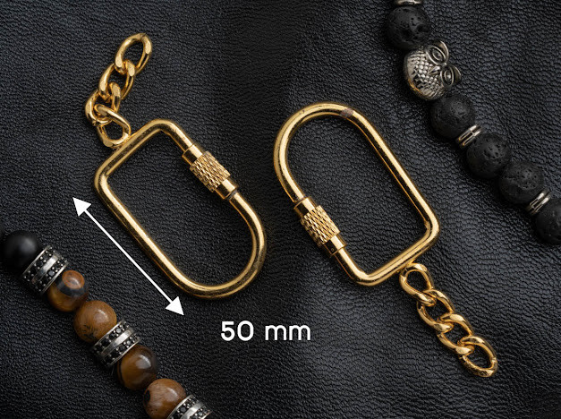 Сполучним елементом кільця і брелока також виступають різні елементи: звичний ланцюжок, кольчуга або змійка (лусочка). Колір та розмір можна підібрати на будь-який смак: благородне срібло, старовинна латунь, золото – у мініатюрних чи масивніших варіантах. Карабіни є різної форми: круглі, овальні та у формі серця.